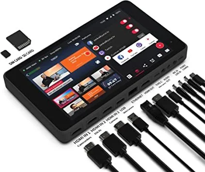 The YoloBox is an all-in-one unit, which means it has a built-in monitor running off its own internal battery and a camera that allows it to sub as a webcam. The monitor is 8 inches with a 1080p display. It has 8 video sources, 3 HDMI, 1 USB, and 1 usb-c for in/out. It also has built-in streaming software running off an Android OS, allowing you to stream with it straight out of the box through an ethernet or wifi connection at up to 1080p and 60 frames per second. It also includes onboard software for live streaming and media mixing, including audio recorded from an available microphone slot.
